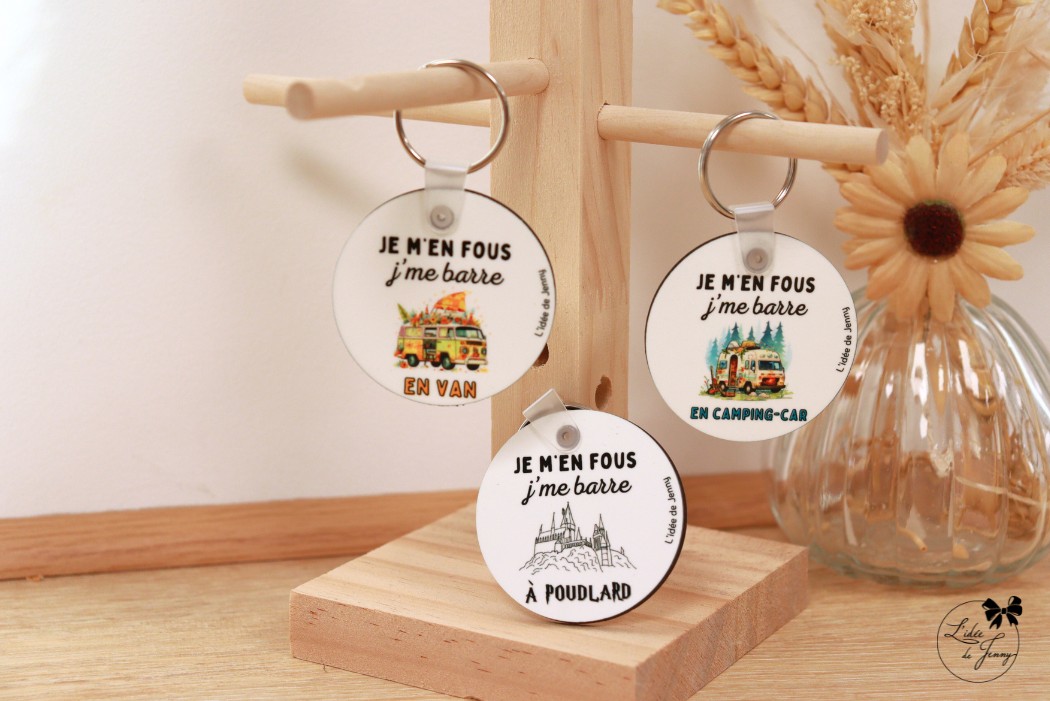 Porte-clés humour en bois, trois modèles au choix : van life, Poudlard ou camping-car. Une idée cadeau fun, légère et parfaite pour un rire assuré !