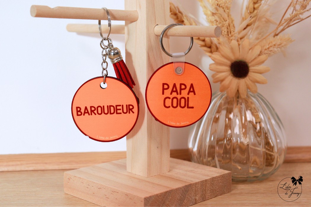 Chaque modèle est fabriqué sur un porte-clé rond en bois, de 4 cm de diamètre.